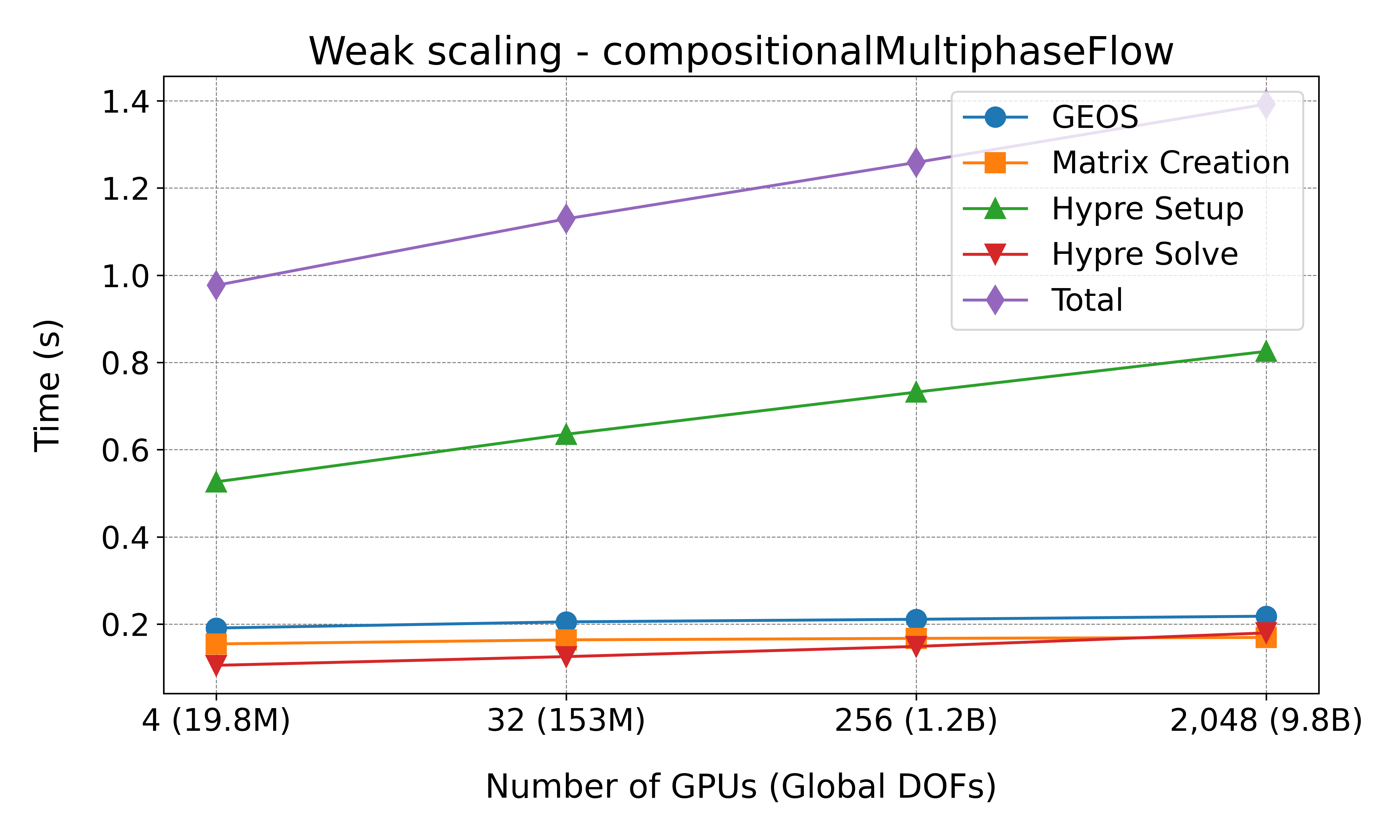 execution times per non-linear step for the following phases: GEOS, matrix creation, Hypre
