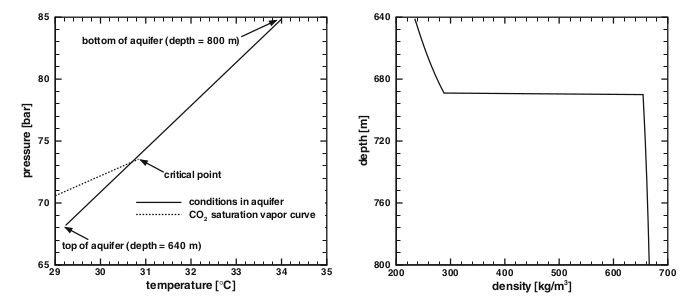 The figure below shows the pressure and temperature in the formation at the mentioned depths (assuming a geothermal gradient of 0.03 K/m). The conditions in the aquifer at the considered depths range from supercritical to liquid to gaseous. The figure also shows the CO2 density at the conditions of the formation. There is a large change in density at a certain depth. This depth corresponds to the point where the line depicting the formation conditions crosses the CO2 saturation vapor curve, that is, the boundary between liquid and gaseous CO2. Other fluid properties such as viscosity also change abruptly at that depth.