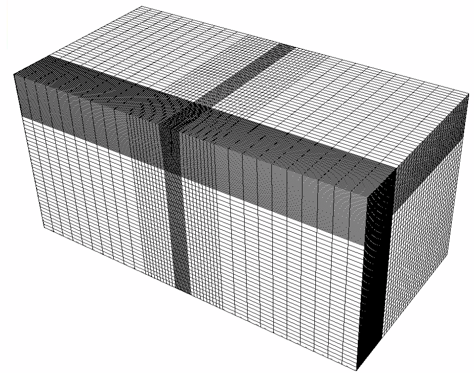 The structured mesh contains 80 x 80 x 60 eight-node brick elements in the x, y, and z directions respectively.