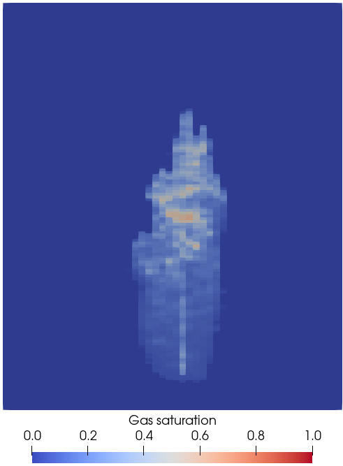 Using Paraview, we can observe the CO 2 plume moving upward under buoyancy effects and forming a gas cap at the top of the domain,